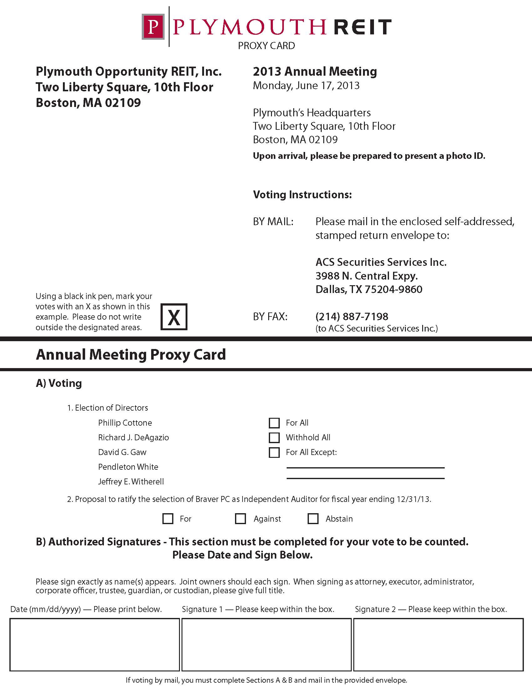 You are invited to attend our annual meeting of stockholders that will be held at Plymouth Opportunity REIT, Inc. Headquarters, Two Liberty Square, 10th Floor, Boston, Massachusetts 02109 on Monday, June 17, 2013 at 10:00 a.m., Eastern Daylight Time. The purpose of the meeting is to vote on the following proposals.