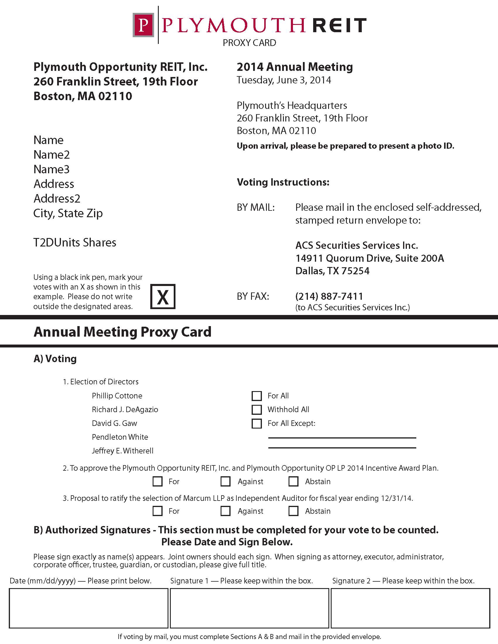 Stockholders of record at the close of business on April 30, 2014 are entitled to notice of, and to vote at, the annual meeting. This proxy statement, a proxy card and our 2013 annual report to stockholders is being mailed to you on or about April 30, 2014. A copy of this proxy statement and our 2013 annual report to stockholders have been posted and made available for viewing online at http://www.plymouthreit.com/plymouth/2013-proxy-ar.pdf. Paper copies will be provided without charge upon written request.