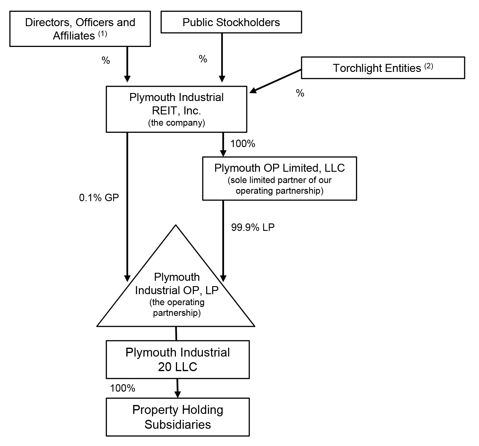 Plymouth Industrial REIT, Inc. is a full service, vertically integrated, self-administered and self-managed real estate investment trust, or REIT, focused on the acquisition, ownership and management of single and multi-tenant Class B industrial properties, including distribution centers, warehouses and light industrial properties, primarily located in secondary and select primary markets across the U.S. Upon completion of this offering and the Torchlight Transactions (as defined herein), we will own 100% of the interests in 20 industrial properties located in seven states with an aggregate of approximately 4.0 million rentable square feet.