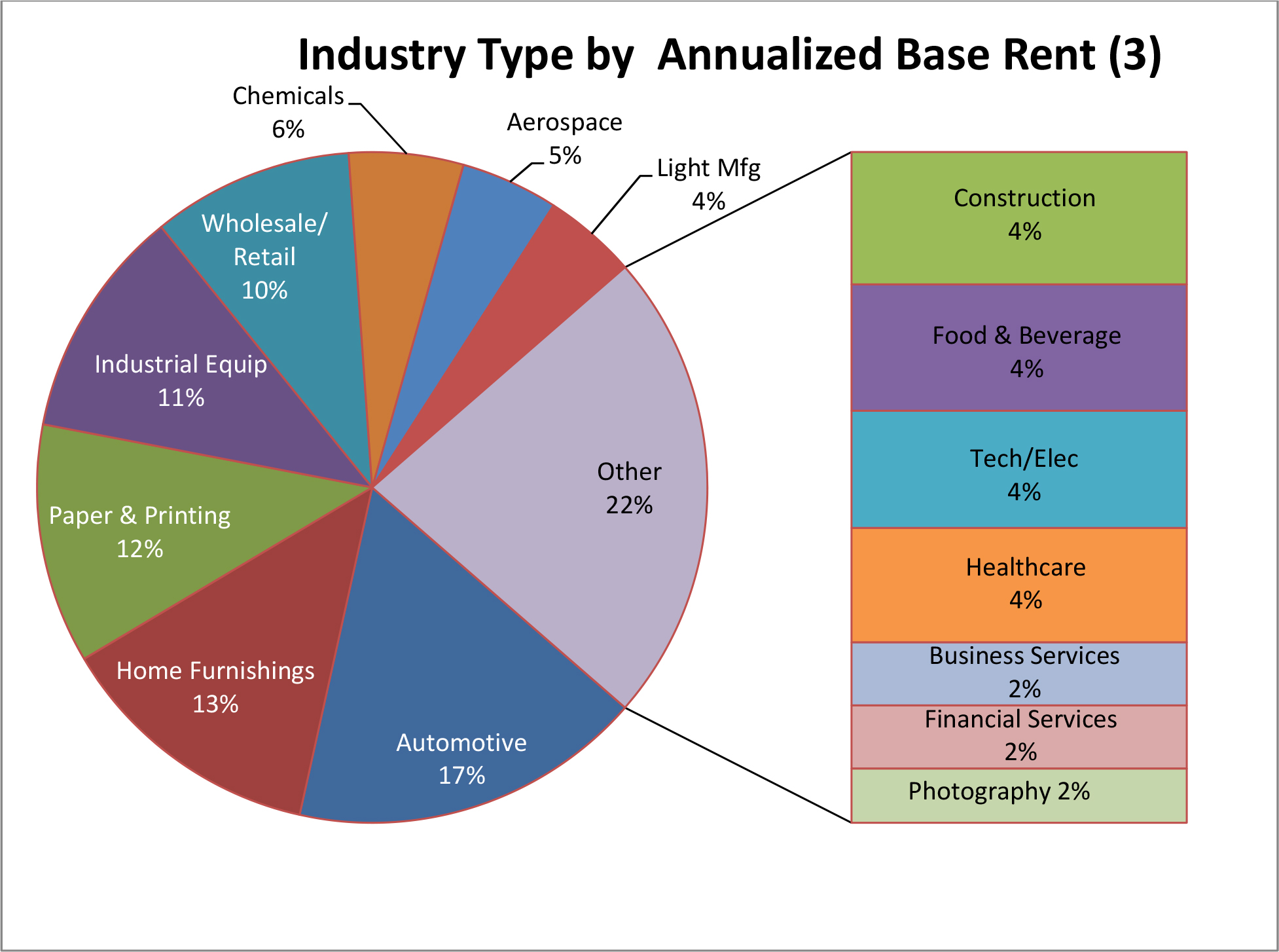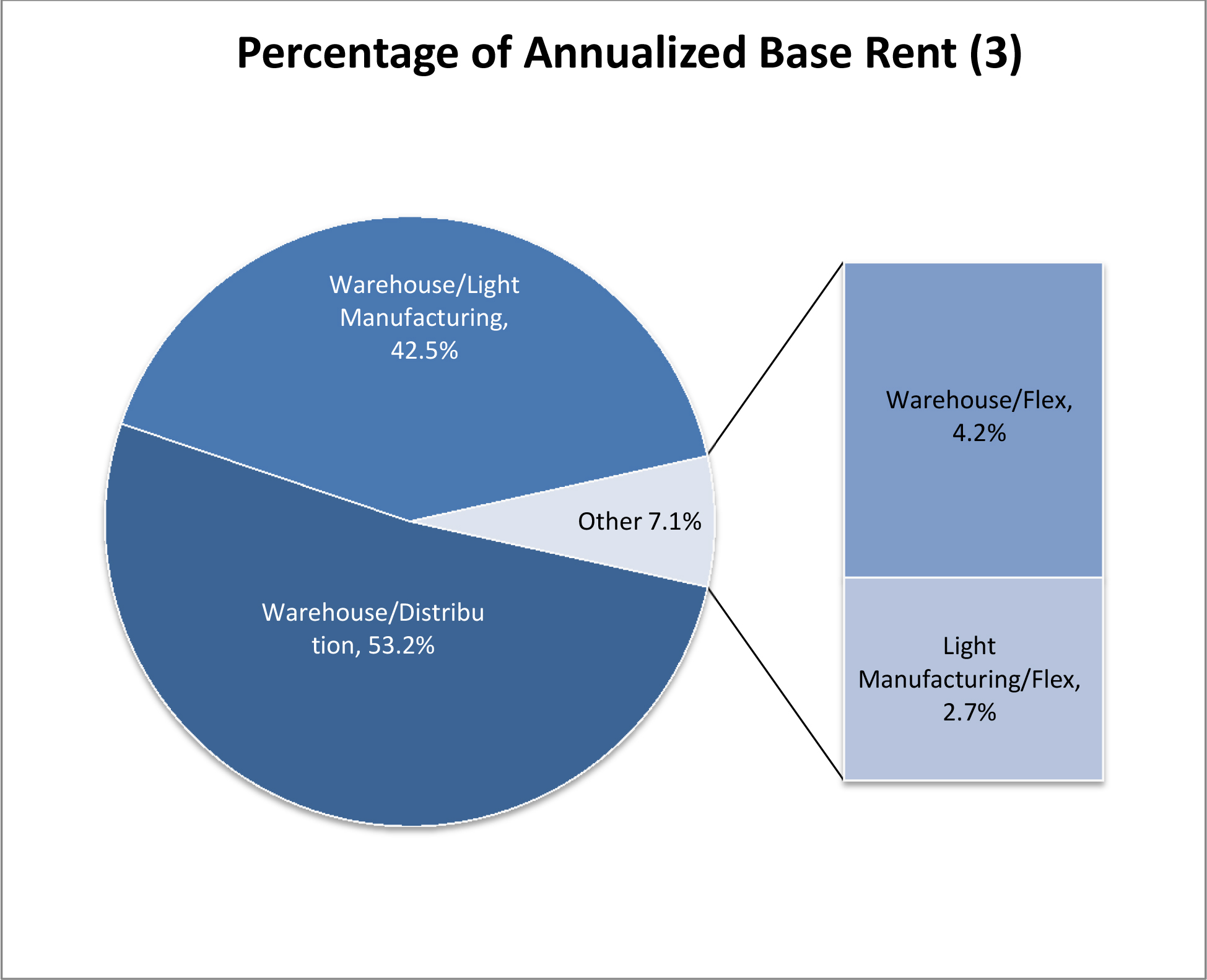 High-Quality Portfolio with Strong Fundamentals: Since 2014, we have acquired a portfolio of 20 industrial assets with an aggregate of over four million square feet of rentable space. As of March 31, 2017, the Company Portfolio was 98.4% leased to 37 different tenants across 17 diversified industries, which we believe reduces our exposure to tenant default risk and earnings volatility. We have realized consistent increases in rental rates since the acquisition of the properties comprising the Company Portfolio. Rental rates on new leases signed in 2016 were approximately 57.1% higher than rental rates on prior leases, and rental rates for renewing tenants increased 3.8%. In addition, our tenant retention rate increased from 17.3% in 2015 to 73.7% in 2016. We believe that high occupancy rates across the Company Portfolio, as well as strong rental growth, are indicative of the consistent execution of our business strategy.