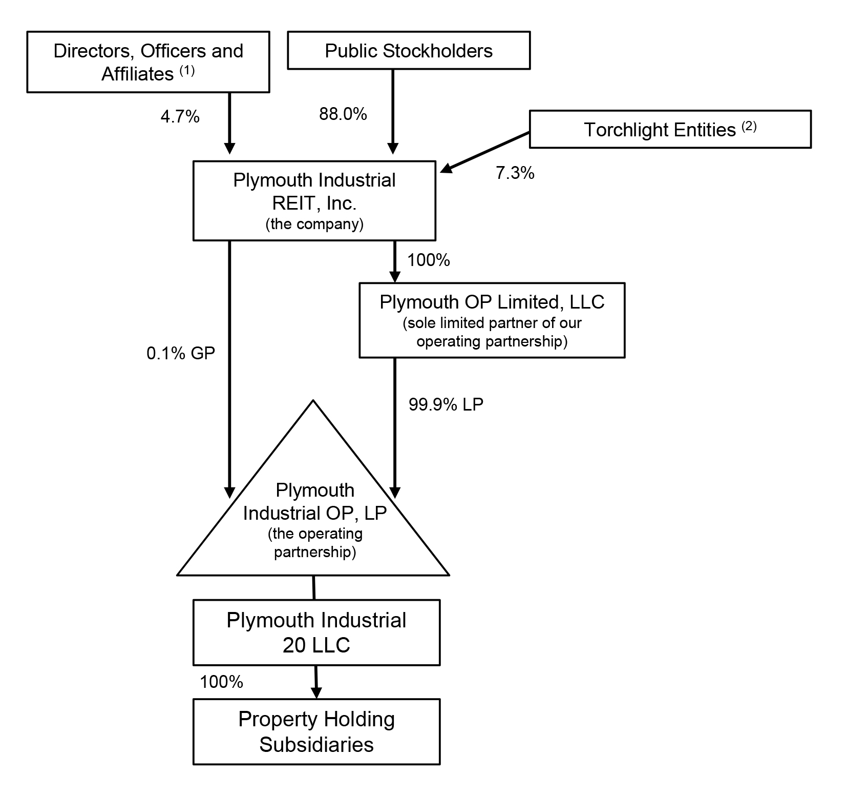 We are a full service, vertically integrated, self-administered and self-managed Maryland corporation focused on the acquisition, ownership and management of single and multi-tenant Class B industrial properties, including distribution centers, warehouses and light industrial properties, primarily located in secondary and select primary markets across the U.S. For our definition of Class B industrial properties, see “—Our Investment and Growth Strategies—Investment Strategy.” The Company Portfolio, which consists of 20 industrial properties located in seven states, is currently held through Plymouth Industrial 20 LLC, a joint venture with Torchlight in which we own a 0.5% interest. In connection with the completion of this offering and the Torchlight Transactions, we will redeem Torchlight’s interest in Plymouth Industrial 20 LLC, or Plymouth Industrial 20, and, as a result, we will own 100% of the interests in the Company Portfolio. See “—Torchlight Transactions.” As of March 31, 2017, the Company Portfolio was 98.4% leased to 37 different tenants across 17 industry types.