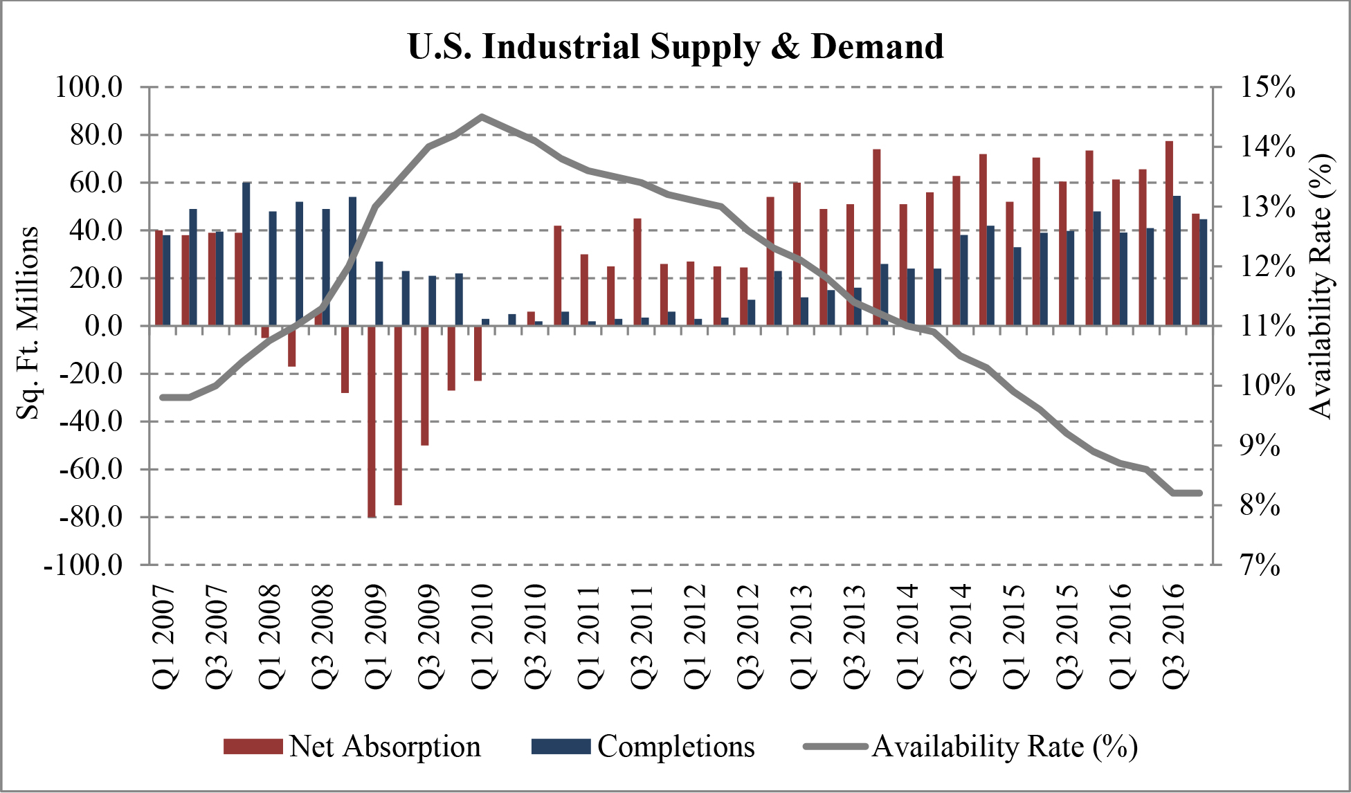 We intend to continue to focus on the acquisition of distribution centers, warehouses and light industrial properties in our target markets across the U.S. We believe that our target markets have exhibited, or will exhibit in the near future, positive demographic trends (i.e., population growth, decreasing unemployment rates, personal income growth and/or favorable tax climates), scarcity of available industrial space and favorable rental growth projections, which should help create superior long-term risk-adjusted returns.