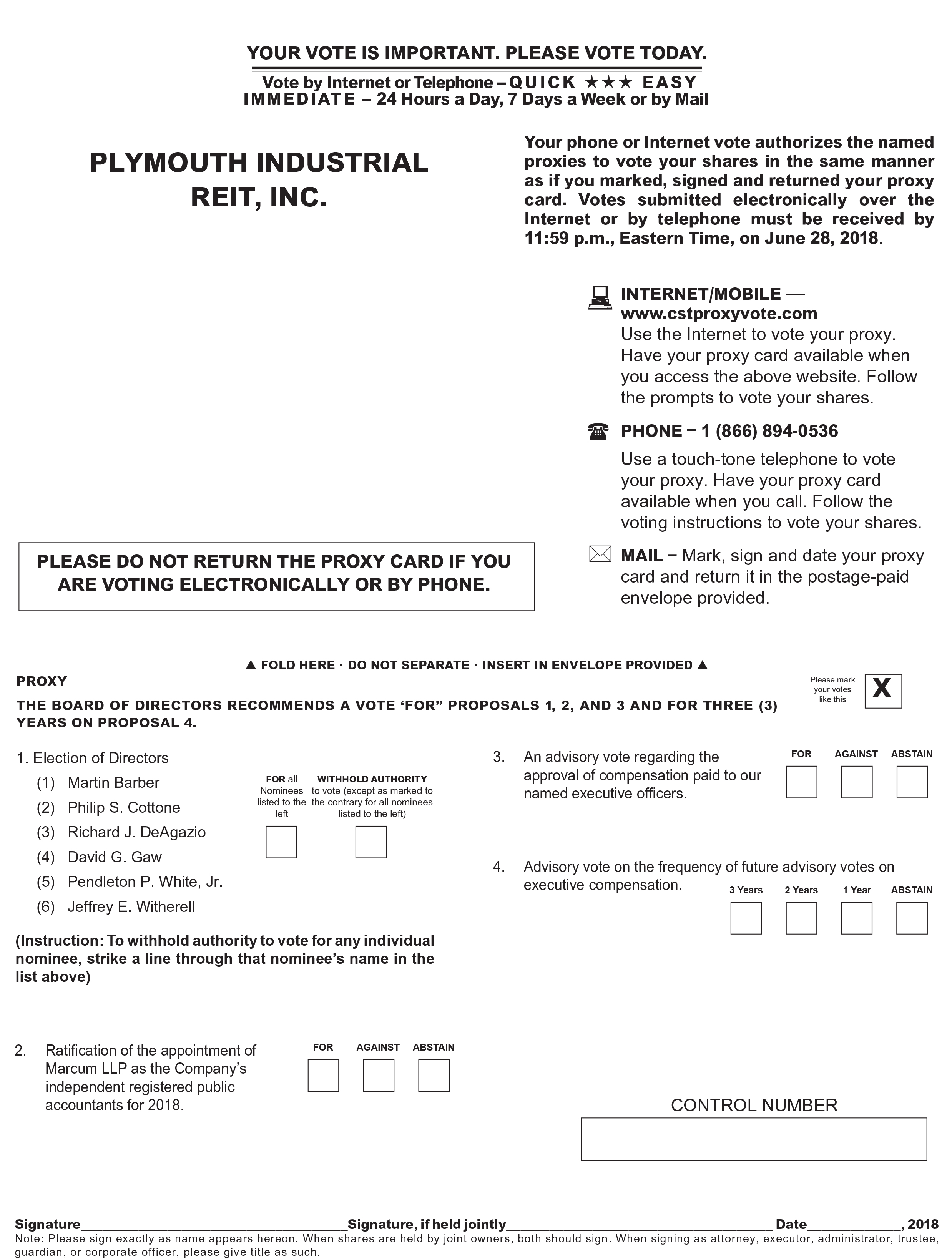 Plymouth Industrial REIT Inc.’s 2018 proxy statement, proxy card and annual report to stockholders are available at www.plymouthreit.com.