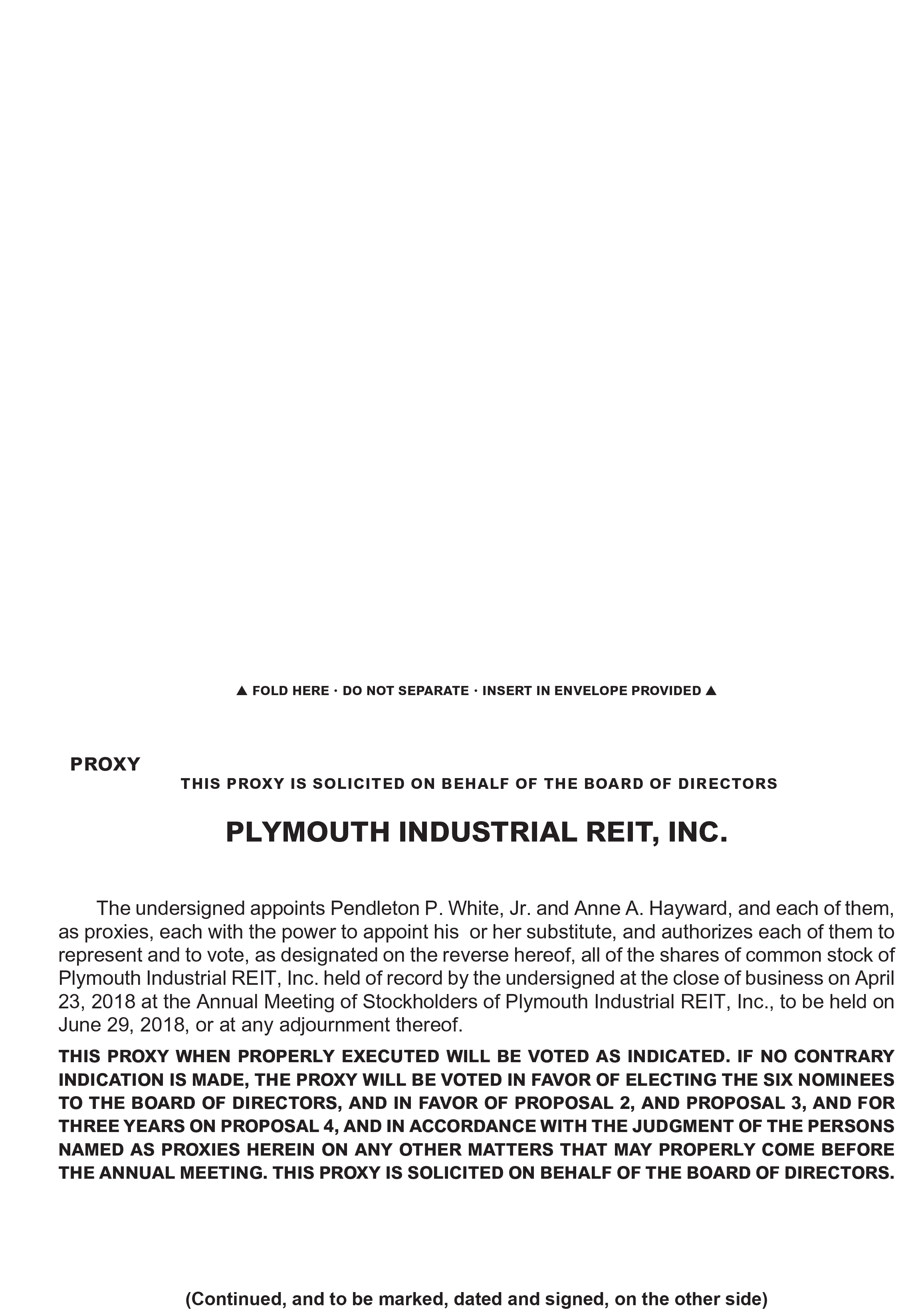On behalf of the Board of Directors, we cordially invite you to attend the 2018 Annual Meeting of Stockholders of Plymouth Industrial REIT, Inc. The annual meeting will be held beginning at 9:00 a.m., Eastern Time, on Friday, June 29, 2018 at the principal offices of Plymouth Industrial REIT, Inc., located at 260 Franklin Street, 7th Floor, Boston, Massachusetts 02110. The formal notice of the annual meeting appears on the next page. At the annual meeting, you will be asked to: