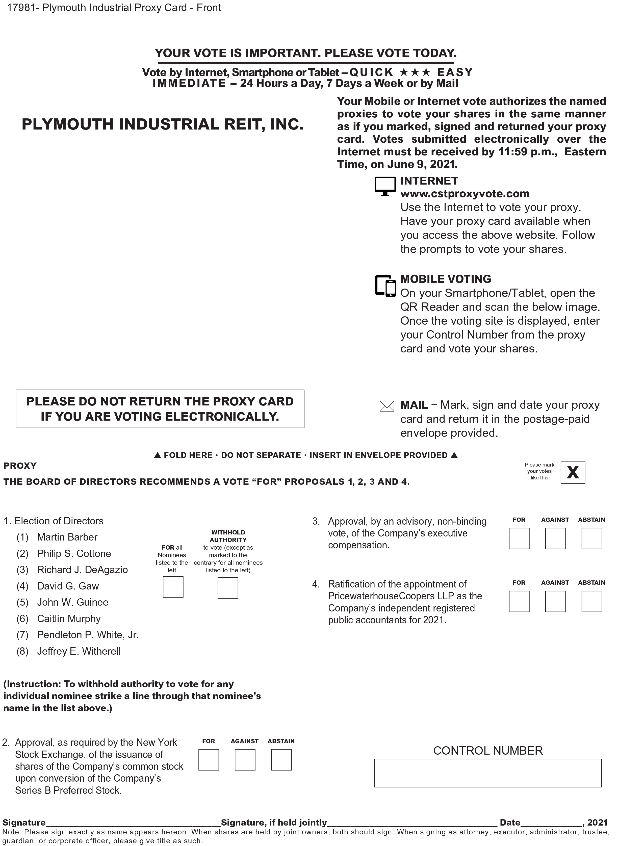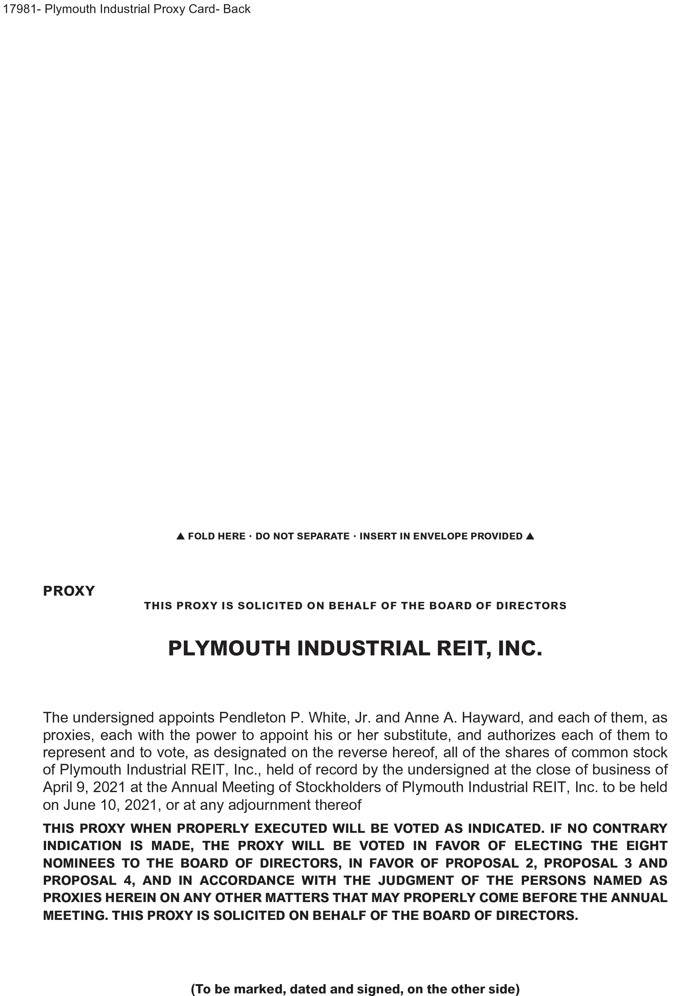 On behalf of the Board of Directors, we cordially invite you to attend the 2021 Annual Meeting of Stockholders of Plymouth Industrial REIT, Inc. (the “Company”). The Annual Meeting will be held beginning at 3:00 p.m., Eastern Time, on Thursday, June 10, 2021 at the principal offices of the Company, located at 20 Custom House Street, 11th Floor, Boston, Massachusetts 02110. At the Annual Meeting, you will be asked to consider and vote on: