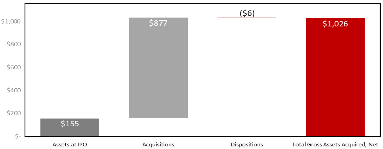 | Purchase Price4 | $ 75,050 | ● | Since the Company's initial public offering in June 2017, the Company has acquired $876.6 million of wholly owned warehouse, distribution, light manufacturing, and small bay industrial properties totaling approximately 21.0 million square feet | |
