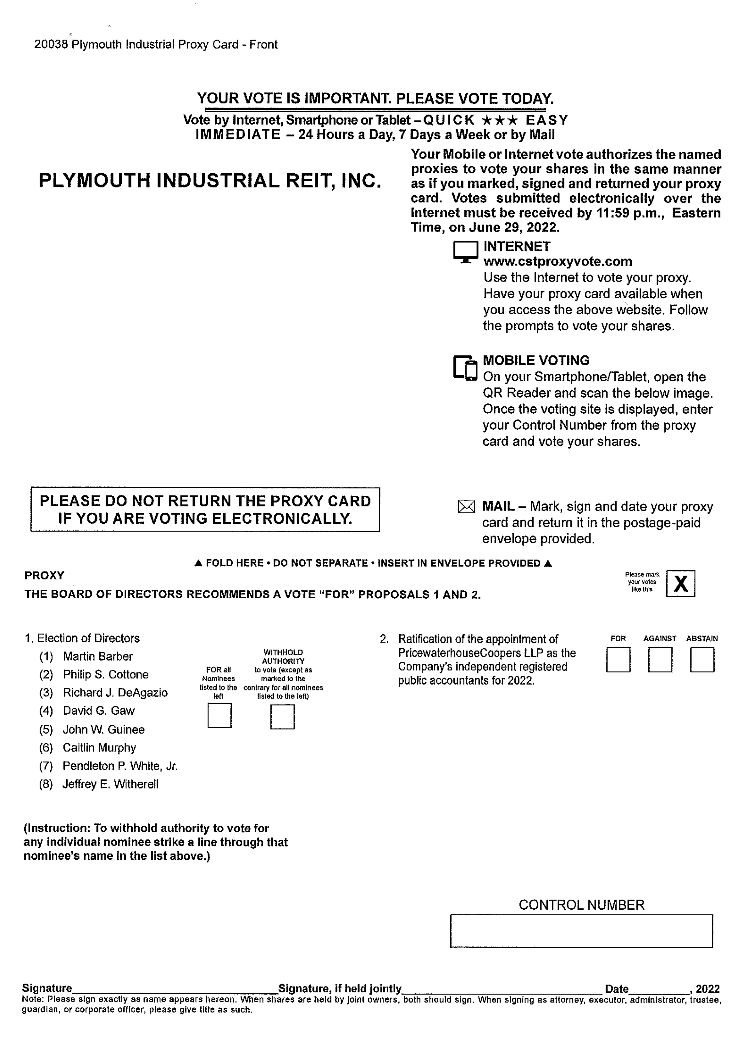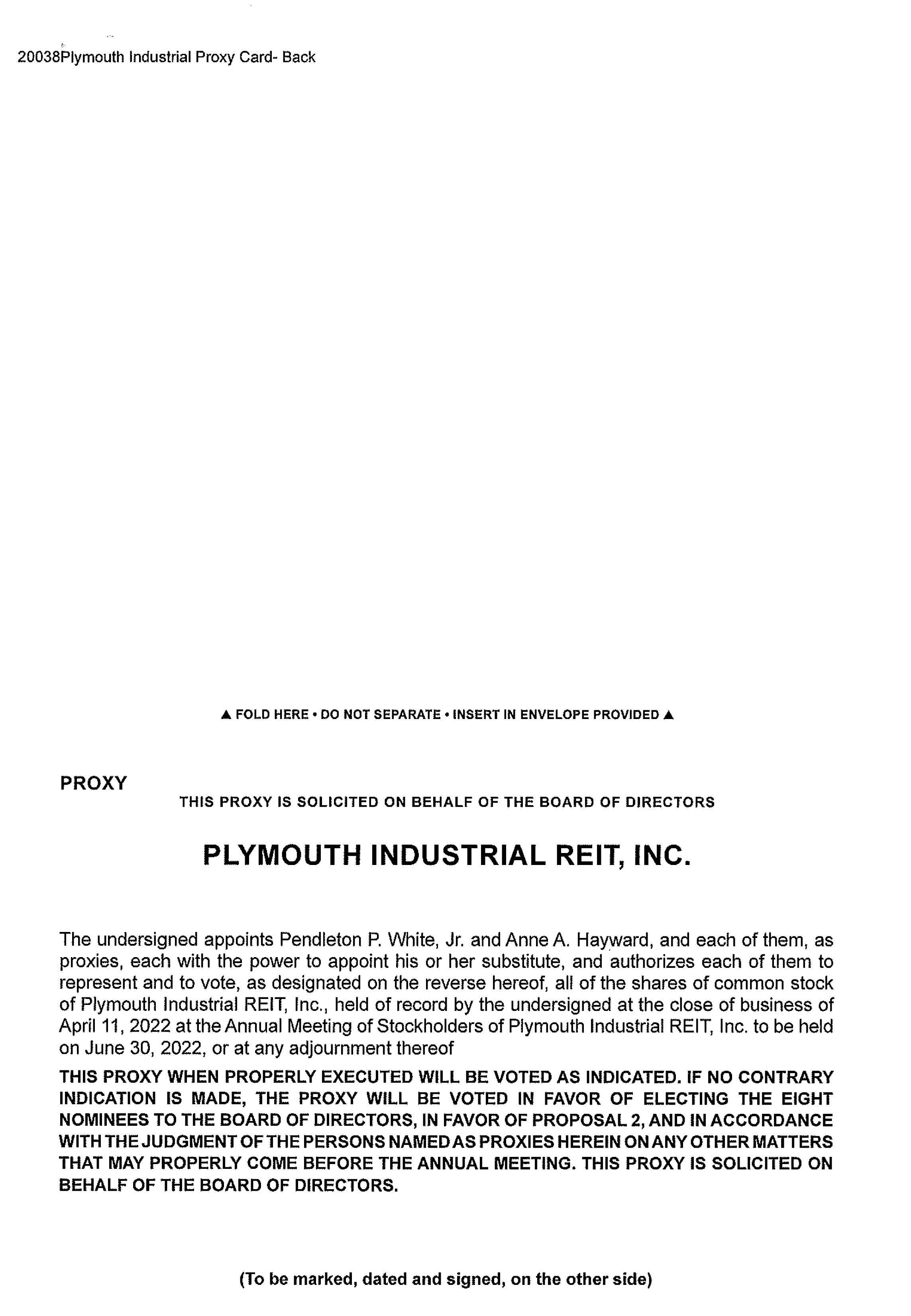 Our Board of Directors is soliciting your proxy to vote your shares of our common stock at the 2022 Annual Meeting of Stockholders because you owned shares of our common stock at the close of business on April 11, 2022, the record date for the annual meeting and are therefore entitled to vote at the Annual Meeting. A Notice of Internet Availability of Proxy Materials, along with a proxy card, is being mailed on or about May 2, 2022 to stockholders of record as of April 11, 2022. We have made the Proxy Statement and 2021 Annual Report available to you on the Internet at the following address: www.plymouthreit.com. The proxy provides you with the opportunity to vote on the proposals presented at the Annual Meeting, whether or not you attend the meeting.