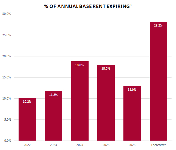 | 3) | In-Place + Uncommenced ABR calculated as in-place current annualized base rent as of March 31, 2022 plus annualized base rent for leases signed but not commenced as of March 31, 2022. |
